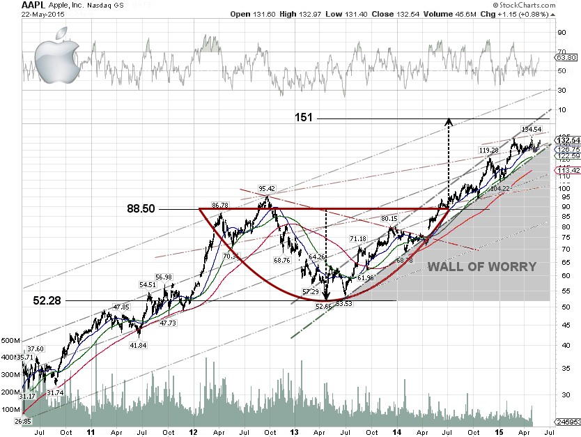 From the cup without handle model, our price projection for AAPL is $151 per-share, determined by adding the depth of the cup pattern to the point of breakout. The stock has been climbing the “Wall of Worry” in a narrow bullish channel as pundits on financial media were raising all kinds of concerns about iPhone sales, competitors such as Samsung and Xiaomi, etc. From the way Apple shares move, the stock could hit our projected price by the time of the release of the fiscal 2015 third quarter earnings report in July.