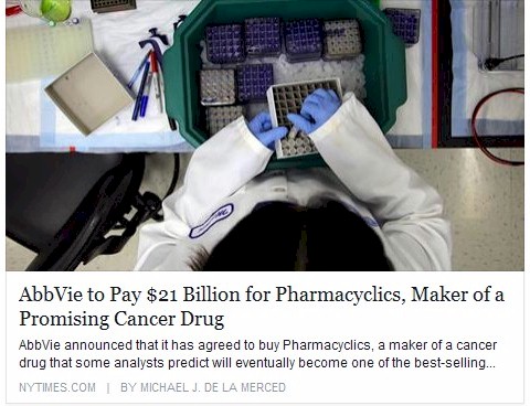 AbbVie Inc [NYSE:ABBV] said on Thursday that the company will acquire Pharmacyclics Inc [NASDAQ:PCYC] for about U.S. $21 billion, giving it access to top-selling chronic lymphocytic leukemia (CLL) drug Imbruvica, and boost its peak annual sales of cancer drugs to over $15 billion in a few years. AbbVie Chief Executive Richard Gonzalez said in a statement that their company could reap more than $7 billion alone in peak annual sales from Imbruvica.