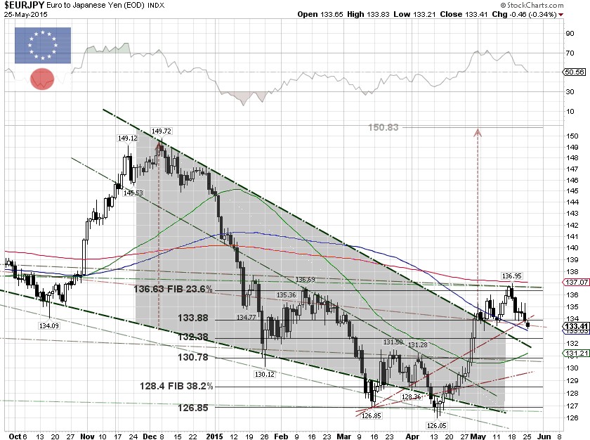 The EUR/JPY closed at 134.59 yen per euro on Wednesday, up 6 pips from the previous close, after the Japan Ministry of Finance said Japan’s growth domestic product (GDP) grew at an annualized rate of 2.4% in the first quarter, beating the 1.5% consensus forecast of economists surveyed by The Wall Street Journal. After stripping out inventories, the first quarter GDP expanded just 0.4%.