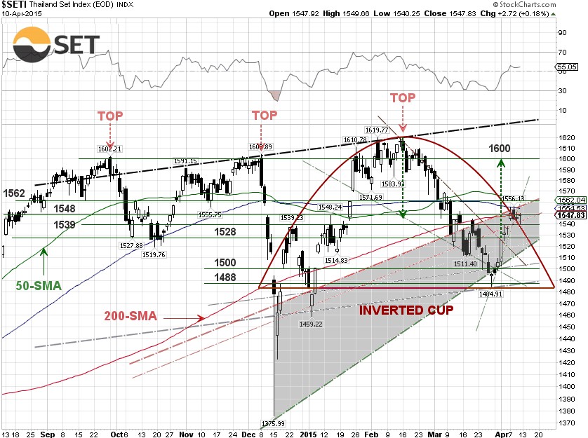 The Thailand SET opened with a 0.6% gap up and moved higher to close at 1,549.53 on Tuesday in response to the weak U.S. payrolls report, which said on Friday that employers added just 126,000 workers in March with the unemployment rate holding steady at 5.5%. It was a huge miss as economists expected non-farm payrolls to rise 245,000. The trading was sluggish as the Thailand SET traded sideways after the Tuesday surge, to close at 1,547.83 on Friday, up 0.77% for the week.