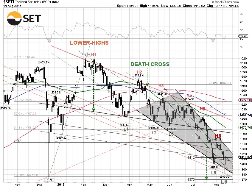 The PBoC said on Thursday that there’s no basis for depreciation to persist and that the central bank will step in to curb large fluctuations. Despite the huge early drop, the SET was able to bounce off the technical low to close at 1,404.15, down 0.3% for the day. The SET recouped some of the losses from the yuan devaluation hangover on Friday to close at 1,415.92, up 0.7% from the previous close. For the week, the index was down 1.04% as foreign investors continued selling into any rally.