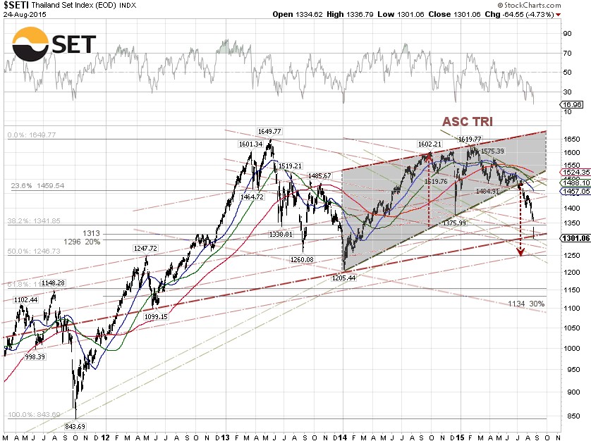 The SET broke through the key technical support at 1,313, to close at 1,301.06 on Monday, down 4.73% for the day, following China's benchmark Shanghai Stock Exchange Composite index 8.46% meltdown. This is how it all went wrong. China's regulators announced late Sunday that it would allow pension funds managed by local governments to invest in the stock market for the first time. The move could potentially channel hundreds of billions of yuan into the struggling China equity market.