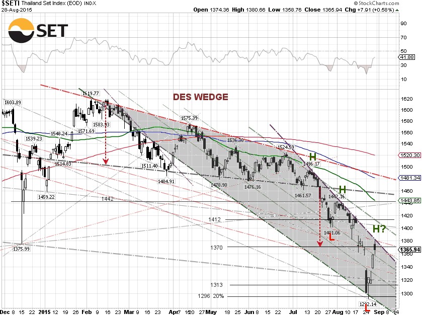 The China equity market rout continued Tuesday, sending the SET down below the key technical support at 1,296. The SET managed to bounce off the trendline support to close at 1,323.88, up 1.75% for the day.