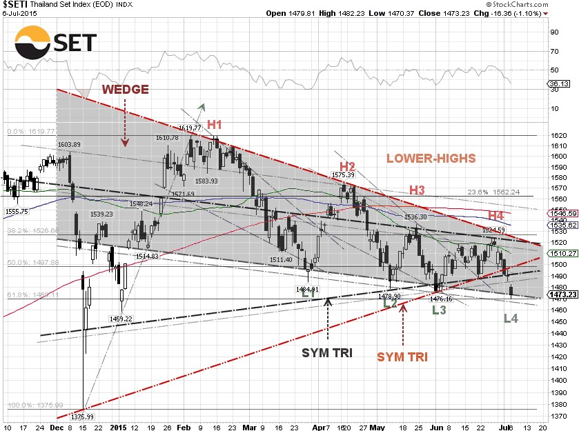 The concern now is that the SET made another new L4 low at 1,473.23 yesterday. The SET has been moving in a bearish lower high (L-H) chart pattern since it peaked in February, meaning every high is lower than the previous high while every low is lower than the previous low. This lower high chart pattern signals a continuous bearish downtrend.