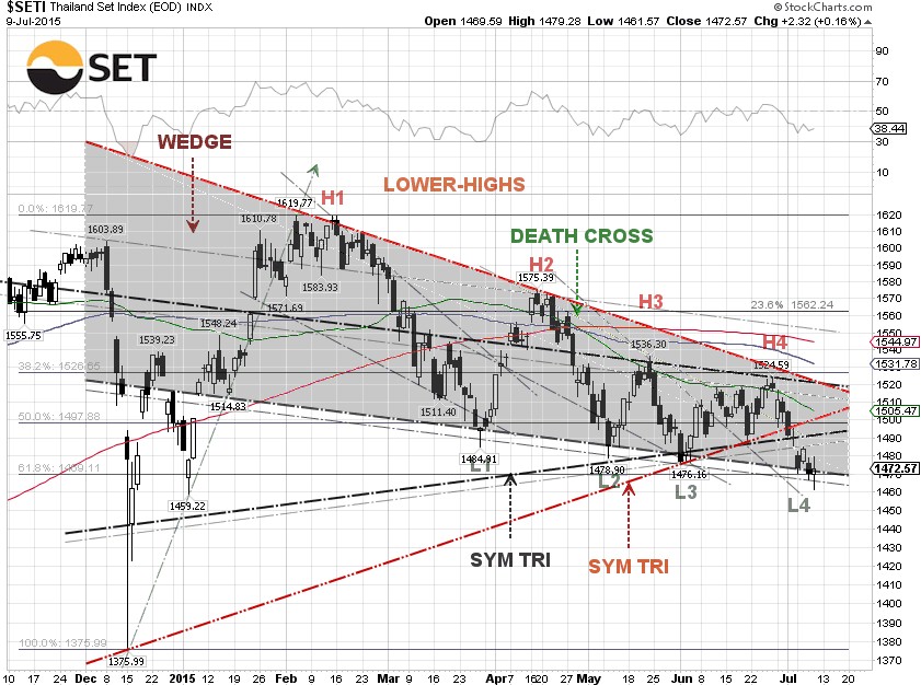 The SET closed at 1,472.57 on Thursday, up 0.16% along with the Shanghai composite index, which rocketed 5.76% higher to 3,709.331 at the close. The bears are skeptical though, as 40% of all Chinese stocks are now halted. The good news is 1,469.1, or the 61.8% Fibonacci retracement level, still holds for now. The bad news is that the price action shows indecision, represented by a spinning top candlestick with a long upper shadow, long lower shadow and small real body. As the symmetrical triangle chart patterns have broken down, the falling wedge breakdown could send the SET downwards, towards 1,375.99 and lower. If the SET breaks down below the 1,450 technical level, the 5-year lower trendline support, it could head even lower to test the long-term supports at 1,307 and 1,110.
