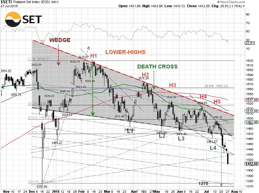 Part of the SET sell-off could be related to the Shanghai composite index’s meltdown, which plunged 8.48% to close at 3,725.56 on Monday, after reports said that brokerages, who have been extending credit during the crisis, have begun restricting margin trading. The news sparked panic selling, especially among China's neophyte retail investors. The IMF urged China last week to exit measures to prop up stocks but no one seems to be listening. The bottom line is that if you are betting big on China, stop doing it.