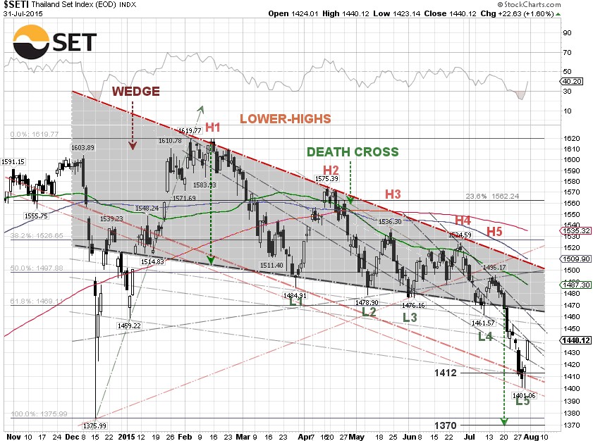 From our technical viewpoint, the SET continues moving in a lower high (L-H) chart pattern since it peaked in February, meaning every high is lower than the previous high while every low is lower than the previous low. This lower high chart pattern signals a continuous bearish downtrend. The L5 level at 1,401.06 may now emerge with the near-term head resistance at 1,452.