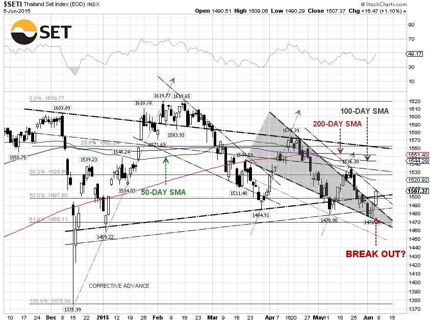 In order to continue its upward trend, the SET needs to break out the trendline resistance at 1,507. The next head resistances are the 50-day SMA at 1,521, 38.2% Fibonacchi level at 1,526.66 and the trendline resistance at the 1,530 level.