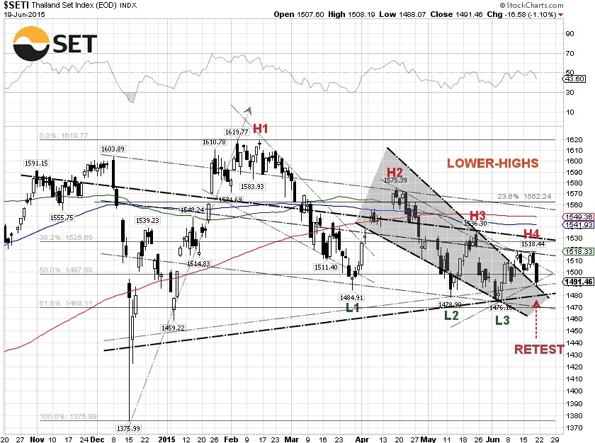 From our technical viewpoint, the SET broke out of the falling wedge last week, but was unable to break through the 100-day SMA at 1,518.33, and the trendline resistance. The SET pulled back and bounced off the trendline supports. The concern is that the SET is moving in a bearish lower high (L-H) chart pattern since it peaked in February, meaning every high is lower than the previous high while every low is lower than the previous low. This lower high chart pattern signals a bearish downtrend, unless the SET is able to close above the H4 level, or 1,518.44.