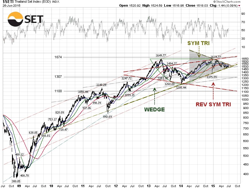 From the long-term technical viewpoint, the SET has been moving in a bearish rising wedge pattern since July 2013. In February, a symmetrical triangle emerged, in which the SET is now bouncing along the lower trendline support. From now until August, the market will have to decide in what direction it will move next. In the event of a symmetrical triangle breakdown, the supports are at 1,307 and 1,110. If the SET breaks out to the upside, the head resistances are 1,649.77 and 1,674.