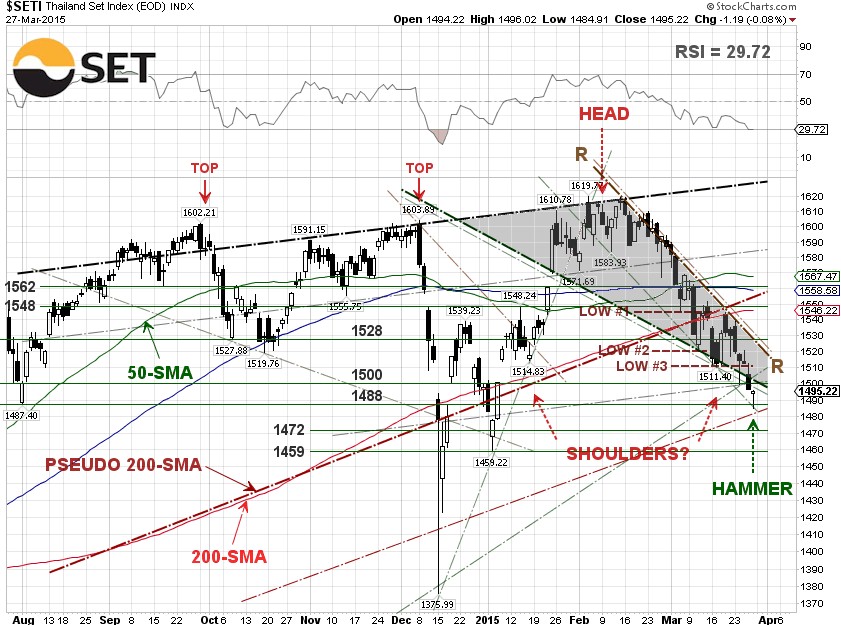 Third, the head-and-shoulders pattern may be confirmed if the Thailand SET continues to pull back and closes below the 1488 level. In our opinion, the projected price is 1357, if the head-and-shoulders pattern is confirmed.