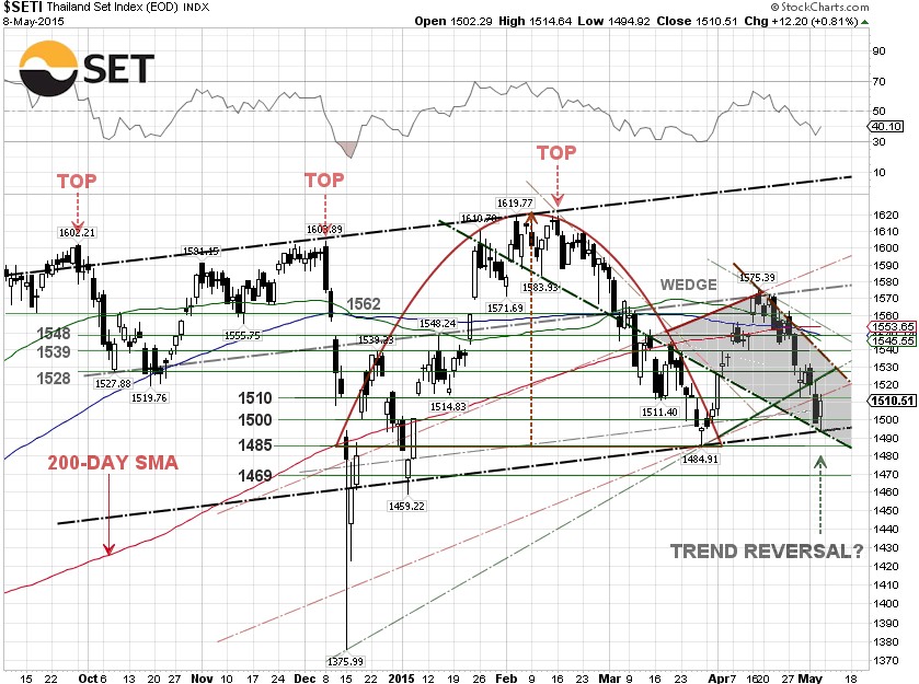 If the Thailand SET can’t bounce from any of these key supports, the projected price is between 1,376 and 1,360, determined by adding the depth of the cup pattern to the rim of the cup at 1,484.91.