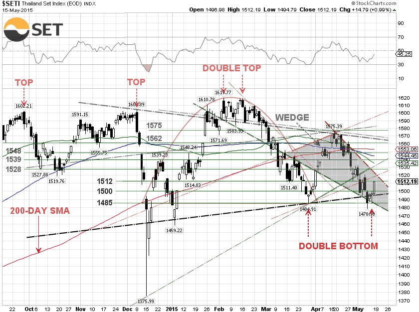 The Thailand SET bounced off the 1,485 support level on Thursday after Finance Minister Sommai Phasee said that he is lowering the growth forecast to 3.5%, from the 3.7% announced in late April. This will be the third GDP cut this year as the economy has struggled to regain traction. In late January, the Fiscal Policy Office (FPO), the Finance Ministry's think tank, made their first adjustment to the economic growth projection for 2015, down to just 3.9% from the previous 4% forecast in December 2014.