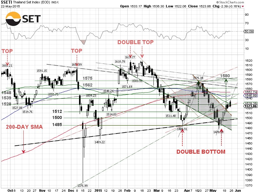 The SET shrugged off the weak economic news released by the National Economic and Social Development Board (NESDB) on Monday, which said that the first-quarter 2015 Thailand gross domestic product (GDP) grew 3.0% from a year earlier, compared with a Reuters poll of a 3.4% gain. The