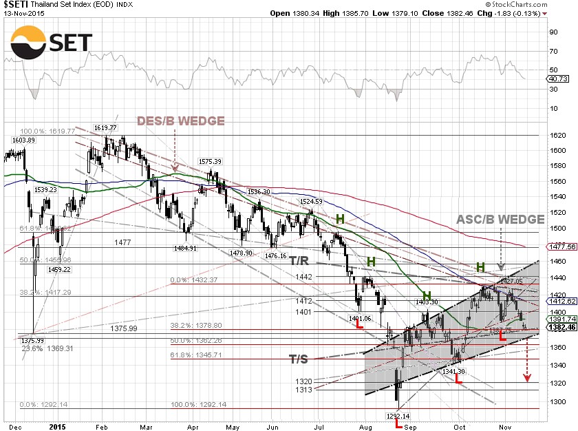 From our technical viewpoint, the bearish ascending broadening (ASC/B) wedge chart pattern has now emerged. The bullish higher low (H-L) chart pattern, meaning every low is higher than the previous low while every high is higher than the previous high, has broken down as the SET closed below 1,387.75. The index is still being supported by a trendline support (T/S) at the 1,382 level. The 1,382 support level might not hold, as selling pressure could increase due to the Paris terrorist attacks.