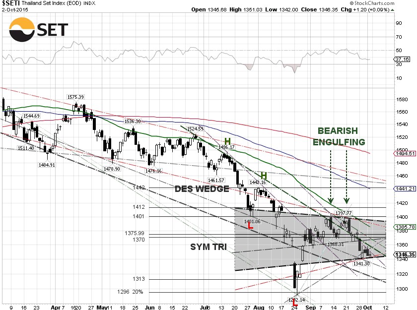 Technically, we had a symmetrical triangle chart pattern breakdown event on Monday which took the SET down 1.79%. A trend reversal for the SET on Tuesday was followed by a lousy bounce on Wednesday. The index is bouncing along the bottom trendline support of the symmetrical triangle and downside risk has significantly increased, as the SET could drop further to retest the 1,310 level.