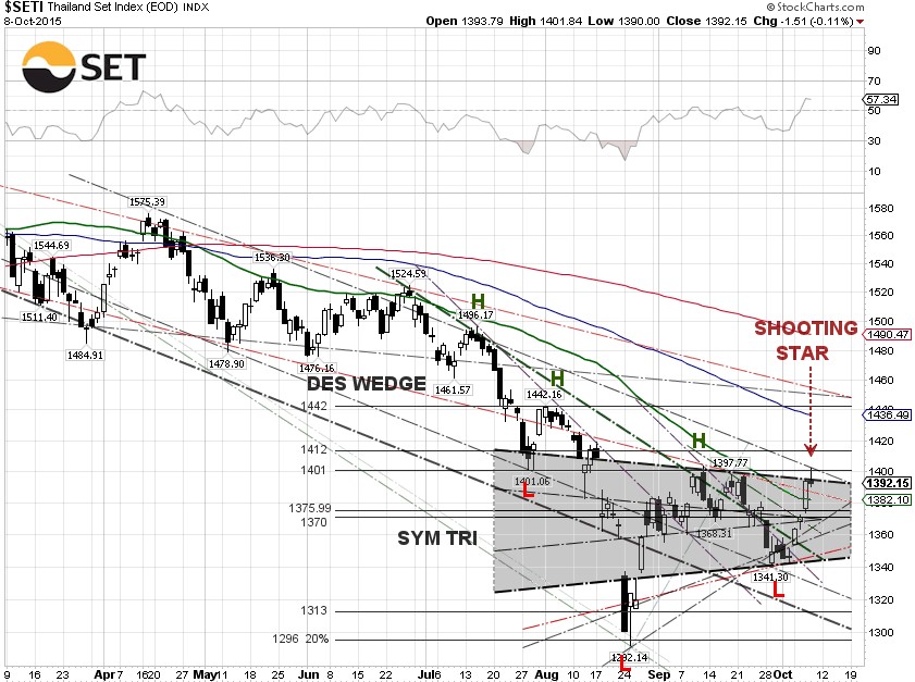 Since the beginning of October, individual investors of the SET have been selling into the rally. According to SET market data, net sells of individuals are topping 10.4 billion baht while foreign investors and proprietary traders have been buying with combined net buys of 9.36 billion baht. During the same period, the SET has been up 3.2%. From the chart, 1,401 represents the overhead supply level at which investors who were trapped in the downtrend market just want to sell at the first opportunity to break even.