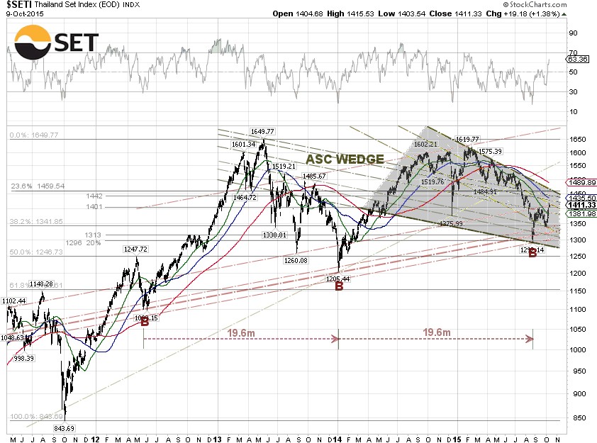 Luckily, not many people trade stocks on either World Bank or IMF data. From a long-term technical viewpoint, the index has been moving in a bullish descending wedge triangle chart pattern since late 2014. The index hit the bottom at 1,292.14 on August 25 and bounced off the lower trendline support of the descending wedge. The period between the two bottoms is about 19.6 months for the last two cycles. The SET is now trading above the 50-day SMA, which is bullish.