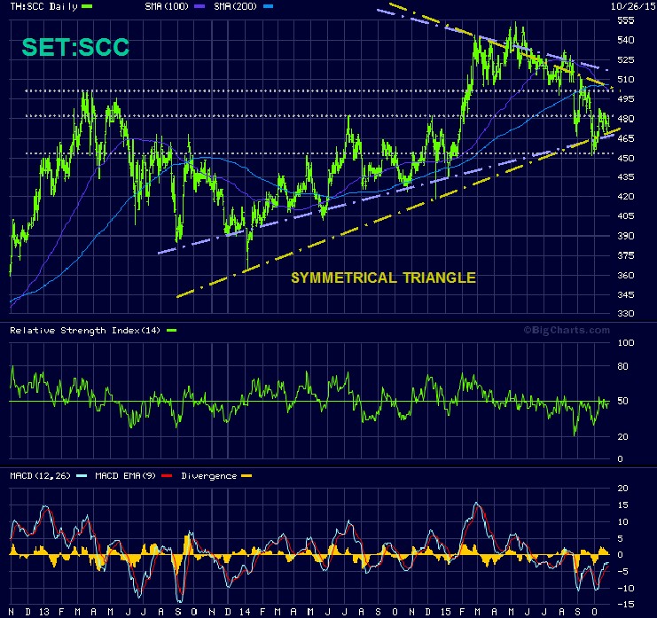 In late September, SCC shares broke down the trendline supports below 460 baht per share after Siam Commercial Bank Pcl [SET:SCB] sold its stake in Siam Cement Pcl to the Crown Property Bureau, a major SCC shareholder, to raise 4.46 billion baht to help to cover provisions for loans to struggling steel firm Sahaviriya Steel Industries [SET:SSI]. Siam Commercial Bank's chief executive Arthid Nanthawithaya said in a press conference that, "The Crown Property Bureau wanted to raise its stakes in Siam Cement. So, the shares changed hands in the same investor group." Investors were confused and didn't take the news very well, also dumping SCC when Siam Commercial Bank sold its Siam Cement shares.