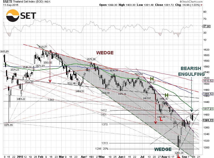 Technically, the SET broke out the trendline resistance of the descending wedge, but is stuck at the 1,401 resistance level. The ascending wedge and bearish engulfing chart patterns have now emerged. The bearish engulfing pattern consists of one white candlestick, followed by the second black candlestick. The bearish engulfing pattern is confirmed if the SET pulls back below the lower trendline resistance of the ascending wedge pattern.
