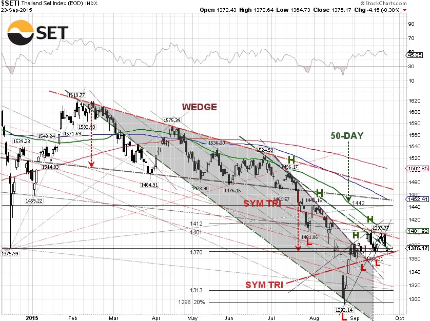 Technically, the SET is still on track for a breakout at the 1,390 level, as the index bounced off the lower trendline support of a symmetrical triangle chart pattern. The SET successfully retested the closing low on September 9 at 1,370.65, on the higher low (H-L) chart pattern. There are still some headline risks ahead, as Fed Chair Janet Yellen will be speaking tomorrow at the University of Massachusetts