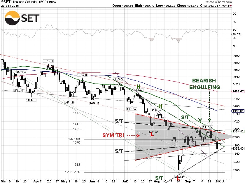 Technically, we have a symmetrical triangle breakdown and a confirmation of the bearish engulfing pattern. Apparently, traders were successful this time to take the market down as they have been trying before. On September 11, the first bearish engulfing pattern, which consists of one white candlestick followed by a second black larger candlestick, had emerged but was not confirmed. The SET is still moving in a symmetrical triangle chart pattern but downside risk has significantly increased.