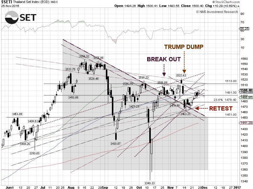 The SET index gained 1.8% for the week to close on Friday at 1,500.40, just above the 1,500 psychological level, despite that the Thai third-quarter 2016 GDP came in at 3.2% on Monday, missing the consensus estimate by 20 basis points and the continuation of foreign investor selling. According to the SET data as of November 25, net sells by foreign investors surged to 31.84 billion baht month-to-date, compared to net sells of 14.48 billion baht during the entire month of November last year. The trading range between 1,491 and 1,513 may be established, but one should pay attention to a 1,513 level retest, as a breakout could send the SET index to the 1,560 level.