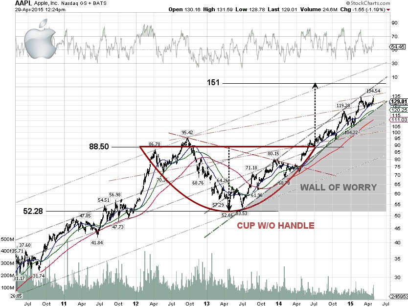 In the 5-year stock chart, the AAPL chart pattern completed a cup shape in June 2014 with the base at $88.50 and bottom at $52.28, giving a cup base depth of about 30%. Most cups come with a handle, or a smaller correction within the base, that serves as a last shakeout before the stock surges to new highs.