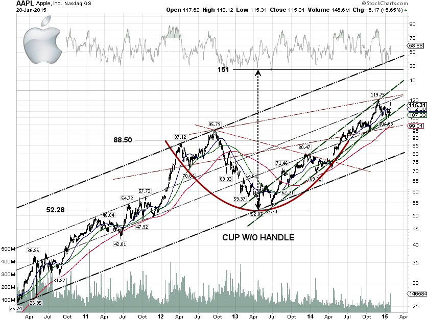 Many technicians expected the stock to pull back in July 2014. Nonetheless, a stock pull back did not materialize as institutional investors and a long list of hedge funds were taking long positions in AAPL while getting out of Google’s stock [NASDAQ:GOOGL]. From the cup without handle model, our price projection for AAPL is $151.