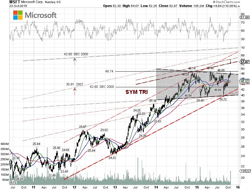 Shares of Microsoft [NASDAQ:MSFT] surged 10.08% on Friday, after the company announced its first-quarter 2016 fiscal year, ended September 2015, non-GAAP revenues of $21.66 billion, down 12.2% from $23.2 billion the same quarter last year, and non-GAAP earnings of $0.67 per diluted share, compared with $0.65 per diluted share in the first-quarter of its 2015 fiscal year.