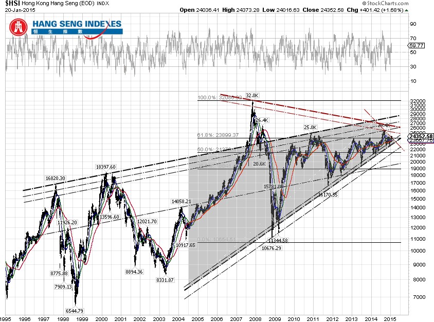 Goldman Sachs analysts just put out a report saying that the People’s Bank of China may ease monetary policies in the next few months as the recent data showed China’s economic growth for 2014 fell short of government targets. China’s stimulus could support the Hang Seng index to move higher and retest the head resistances at 24,600 and 25,400 before breaking out.