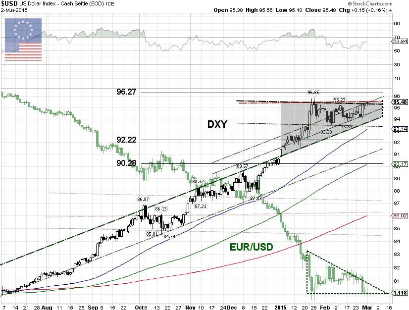 The U.S. dollar index (DXY) shrugged off weaker-than-expected U.S. economic data on Monday and rose slightly to close at 95.462. The Bureau of Economic Analysis (BEA), U.S. Commerce Department, said on Monday that personal spending fell 0.2% in January, worse than the expected decline of 0.1%. Weak consumer spending prompted analysts at Morgan Stanley to cut their first-quarter 2015 U.S. GDP growth estimate by five-tenths of a percentage point to a 2.3% annual pace, according to Reuters.